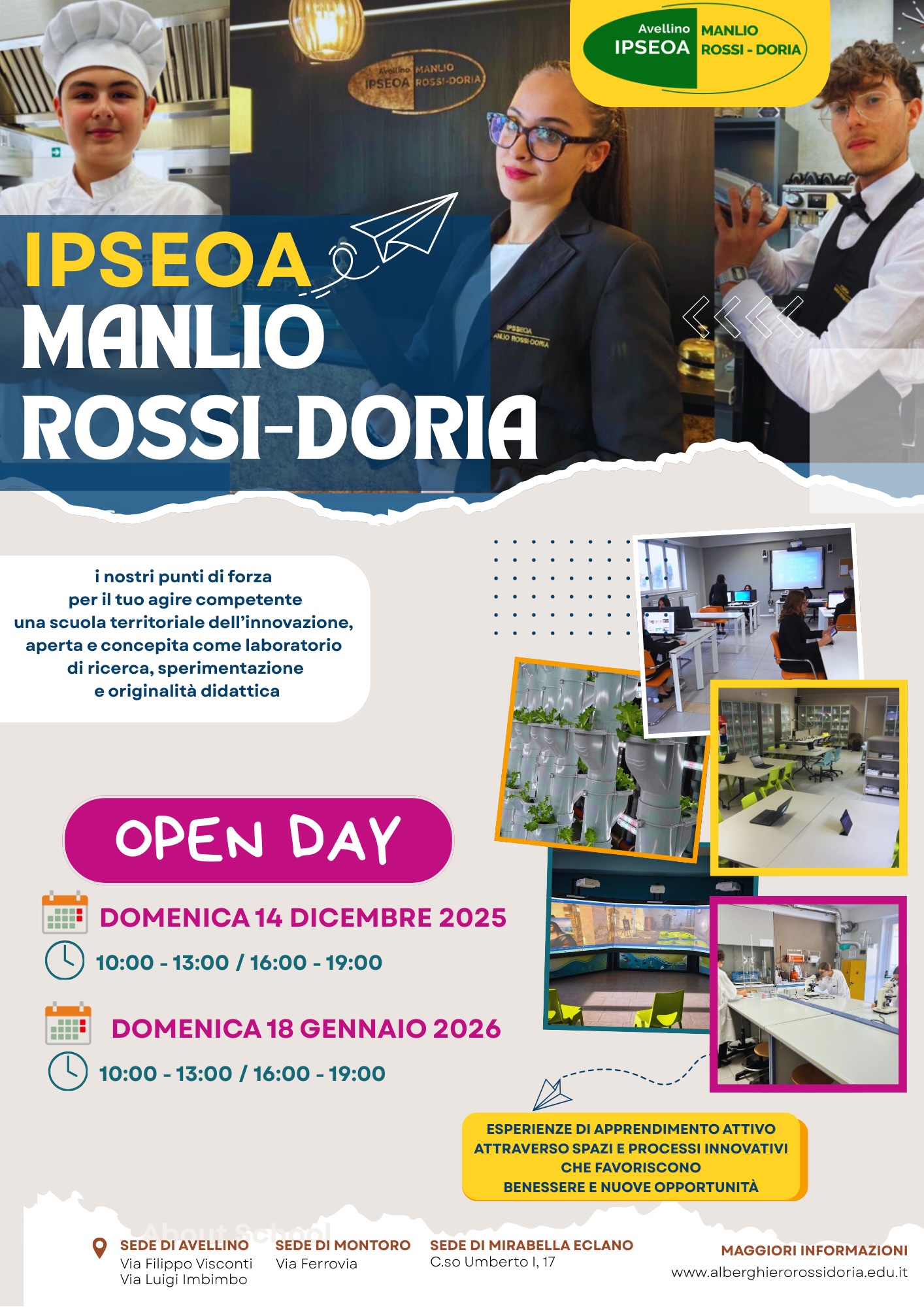 L’IPSEOA Manlio Rossi-Doria apre le sue porte a studenti e famiglie per due giornate di orientamento dedicate a chi desidera conoscere da vicino l’offerta formativa dell’Istituto e le numerose opportunità professionali del settore dell’ospitalità e dell’enogastronomia.